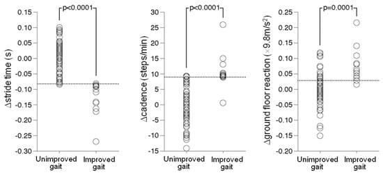 Comparisons of Δ-values in each gait test parameter between patients with and without subjectively improved gait are shown in Figure 1. Patients with subjectively improved gait (−0.127 ± 0.056 s) showed a significantly lower Δ-value in stride time compared to patients without subjectively improved gait (0.002 ± 0.057 s; p < 0.0001). Patients with subjectively improved gait (cadence, 10.8 ± 5.8 steps/min; ground floor reaction, 0.078 ± 0.056 × 9.8 m/s2) showed significantly greater Δ-values for cadence and ground floor reaction than patients without subjectively improved gait (cadence, −0.321 ± 6.2 steps/min; ground floor reaction, 0.006 ± 0.056 × 9.8 m/s2) (cadence, p < 0.0001; ground floor reaction, p = 0.0001).