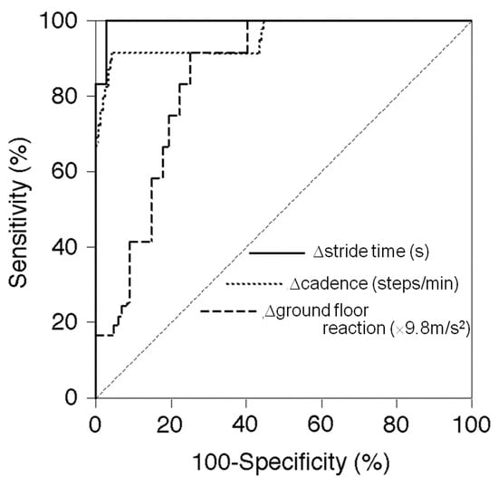 Based on Figure 1, the ROC curve for Δ-values in each gait test parameter for detecting subjectively improved gait were calculated as shown in Figure 2. AUCs for Δ-values in stride time, cadence, and ground floor reaction were 0.995 (95%CI, 0.945–1.000), 0.958 (95%CI, 0.887–0.990), and 0.851 (95%CI, 0.753–0.921), respectively. AUCs for Δstride time (difference between AUCs, 0.144; p = 0.0019) and Δcadence (difference between AUCs, 0.107; p = 0.0100) were significantly greater than that for Δground floor reaction. AUC did not differ between Δstride time and Δcadence (difference between AUCs, 0.037; p = 0.3147).