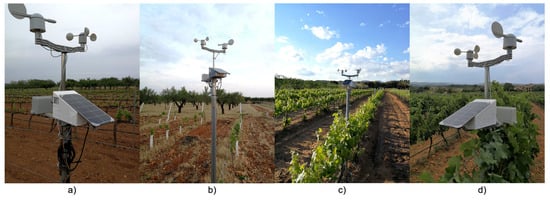 The incorporation of Information and Communication Technologies (ICT) through the smart farming [] movement, along with the reduced cost of electronic components, has favoured the increase in meteorological monitoring stations in order to know first-hand the state of the smallholdings. This knowledge is especially decisive in the cultivation of vineyards []. Meteorological monitoring within the vineyard parcels is vital to detect and anticipate possible fungal diseases. In particular, the phenomena of temperature, humidity and precipitation are the most critical factors to control possible fungal diseases. Examples of these vineyard diseases are downy mildew, powdery mildew, black rot and botrytis [].