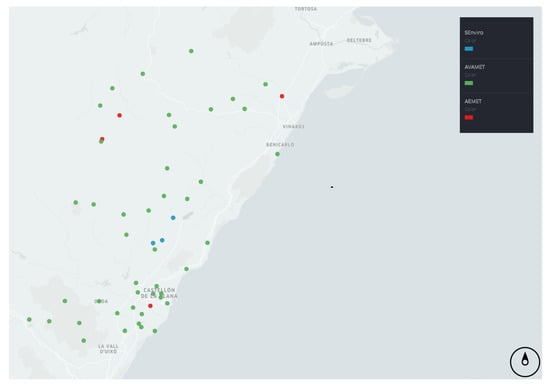 The study area used in this work was Castelló, due to the fact that the SEnviro nodes are located on smallholdings in this province and, hence, only those weather stations have been considered. In the case of the AEMET network, there are five stations located in the area. For the AVAMET network, 63 stations have been installed in the province of Castelló, mainly within localities and on municipal property. Figure 3 shows the location of each of the stations that have been used for this study. The green stations are those belonging to the AVAMET network, the red ones belong to the AEMET network and the blue ones are part of the SEnviro network.