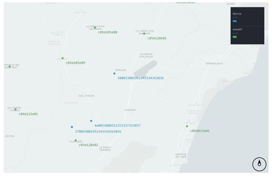 The data used to conduct this evaluation arrived from three different low-cost nodes stationed in vineyard smallholdings placed in the province of Castelló, in the Valencian Community, Spain (Figure 3). All SEnviro nodes are included in a circular bounding box with a diameter of 4 km. The study area is between 240 to 320 m above sea level. The predominant climate is local steppe. There is little rainfall throughout the year. This climate is considered BSk according to the Köppen–Geiger climate classification. It should be noted that the province of Castelló is an area of great climatic variety due to its mountainous orography [,], with high temperatures in summer and very low ones in winter, and an important difference between the coast and the interior. The average temperature in this zone is 14.00 degrees (C), and the approximate precipitation is 434 mm.