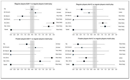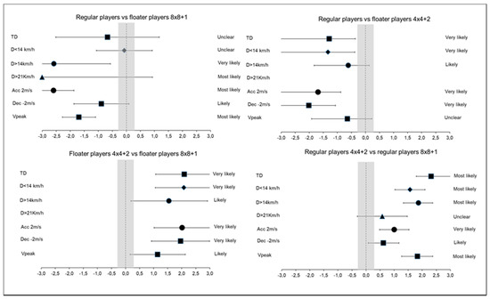 Table 5 shows the comparisons in the physical demands encountered by floaters and regular players between the 8vs8 + 1 LSG and the 4vs4 + 2 SSG and the match-play. During match-play, players showed most likely–probably differences in D > 14.4/min (ES: 4.72), D > 21/min (ES: 24.24) and Vpeak (ES: 7.44) in comparison to floaters in the 8vs8 + 1 LSG, but unclear differences were reported in TD/min, D < 14.4/min and Dec > 2/min (Figure 2).
