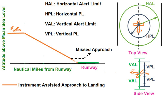 In order to guarantee reliability, a GNSS signal integrity monitor is integrated with avionics. Integrity is considered an essential performance metric in aviation. It is a measure of trustworthiness of a system [10]. An integrity monitor is designed to issue alarms to pilots within a prescribed time, when reliable GNSS performance cannot be ensured. To this end, it carries out continuous fault detection tests and raises an alarm in case a fault is detected. If no fault is identified, the monitor outputs a bound on position error named protection level (PL). The PL protects error in estimated position with a large probability. As an example, Figure 1 illustrates PLs for an approach to landing application.