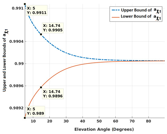 It is a product of q ratios. Each ratio will have an accompanying when is multiplied with the product. Using Equations (9)–(11), Figure 2 shows how the upper and lower bounds of (=) vary for GPS satellites with elevation angles at epoch ℓ. It is evident from the equations that maximum change in elevation angle between two successive epochs would maximize , which is also higher when > . The maximum change in elevation angle between two epochs of 1 s interval is calculated in radians as follows.