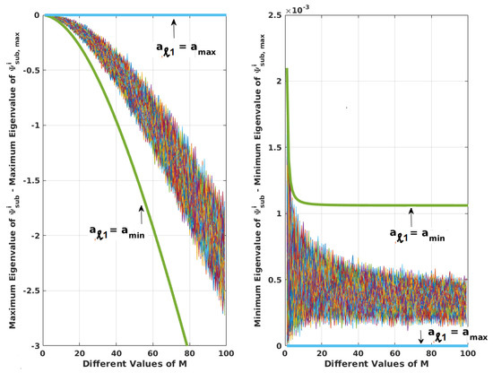 Comparison of maximum and minimum eigenvalues of and for different M. There are values for each M. Upper and lower limits are shown, ∀ = and = . This figure can be regenerated with the Matlab program, matlab_prog_figures_3_A1.m provided in the Supplementary Materials.
