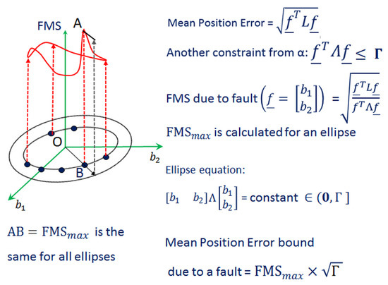 With the designed and , fault detection thresholds, for and for , can be determined from the Chi square distribution with probability and DOF = , where is the dimension of the null space of . The number two is multiplied for the second term of Equation (43). If either exceeds or exceeds or both happen, a fault is declared. Calculation of the mean position error bounds is detailed next.