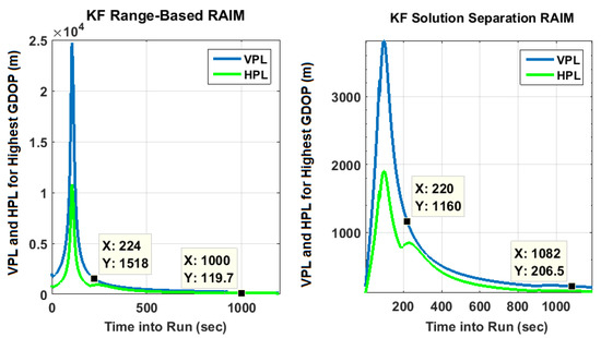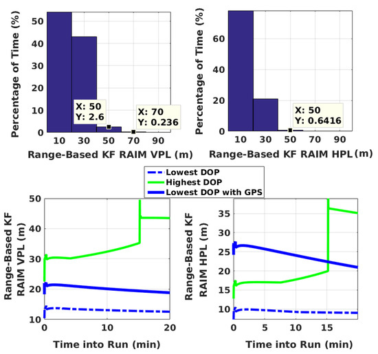 It is important to note that the DOF of , and and VPE grow with time. However, as HPE and VPE have very small contributions, VPE and HPE do not have the same growing trend over time. It is justified through simulation results that with three test statistics and mean position error bounds as calculated in the preceding equations, PL does not grow over time, unlike the PL with a single test statistic. Faults are also detected in a shorter time than that with a single test formed using all innovation terms from the beginning up to the current epoch. The reason is that the growing DOF of a single test statistic increases the fault detection threshold fast, resulting in late detection of faults. PLs are computed using the above-mentioned mean position error bounds under the assumption of a single satellite fault.
