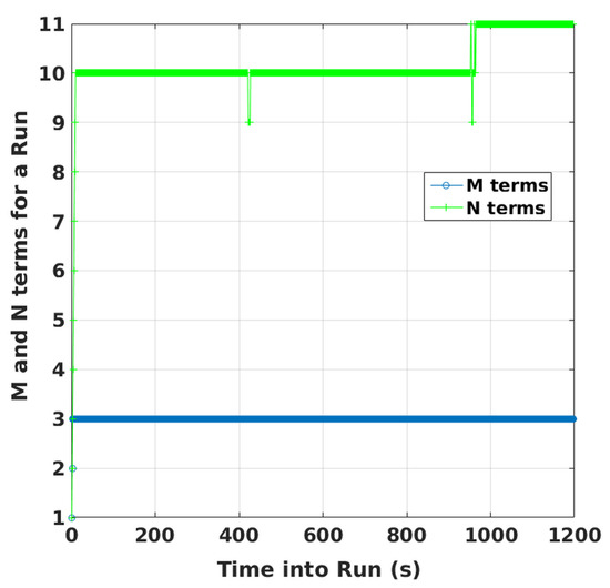 is determined based on prior information about user dynamics and receiver clock power spectral density. is a diagonal matrix. Its ith diagonal term is given by so that the standard deviation of the ith GM state is equal to at steady state. In , a small variance of is used for pseudorange measurements to avoid numerical issues with the SKF implementation. When a satellite sets or a new satellite comes into visibility, the variance is increased to for 10 s to deal with transients. is the pseudorange rate error covariance matrix whose diagonal terms are appropriately chosen for a C/N of 45 dB-Hz. The measurement model matrix is defined in [52]. It has additional columns for receiver clock bias and drift of NavIC, in addition to those for GPS. = . Its dimension is provided in the subscript. The a priori error covariance matrix and Kalman gain can be partitioned for estimated states and “consider” parameters as