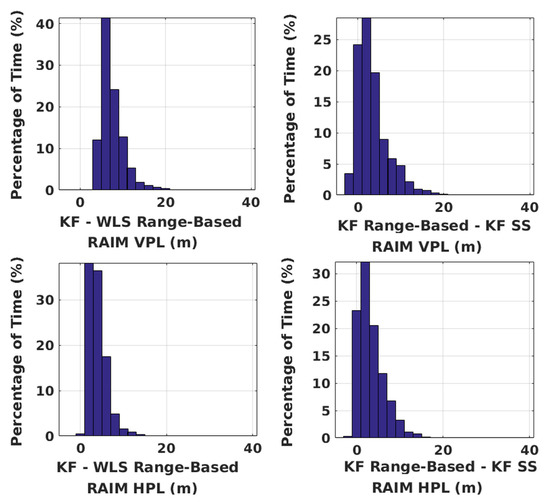 It is apparent from the table that the two existing algorithms offer higher availability than range-based KF RAIM. It is observed that its PL sometimes exhibits an instantaneous change when a satellite sets or rises. If such a change can be smoothed out by some method, its availability would increase to 98.46% in the vertical direction and 98.89% in the horizontal direction. This will be carried out in future work.