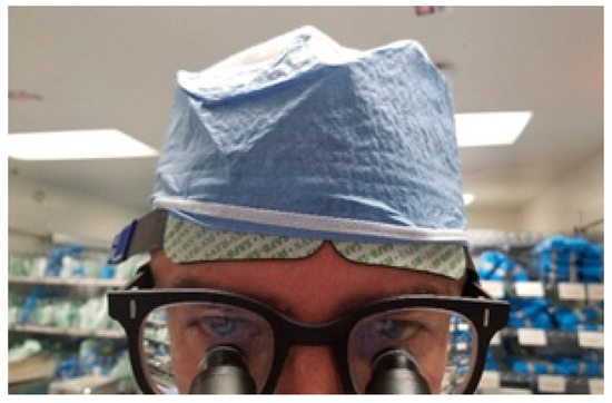 The surgeon was also simultaneously equipped with a two-channel cerebral/somatic oximeter (INVOS™ 5100C Cerebral/Somatic Oximeter, Medtronic) applied on the forehead (Figure 1) to collect estimations of left and right PFC regional cerebral oxygen saturation (rSO2). In this configuration, each NIRS sensor included one emitter and two photo detectors to capture global activation of the left PFC and global activation of the right PFC. Two depths of light penetration are utilized to subtract out surface data, producing a regional oxygenation value for deeper tissues. rSO2 values generated from this device represent the balance of regional oxygen delivery and consumption, as well as any disturbances to this balance. Skin was prepped with alcohol pads and dried prior to sensor placement, and sensor placement was subsequently completed according to manufacturer specifications for adult cerebral sensor placement. According to the recommended specifications, the two sensors were placed directly apposing one another, with sufficient distance between the embedded emitters. One preamplifier connected the disposable NIRS sensors to the INVOS™ monitor via reusable sensor cable connectors.