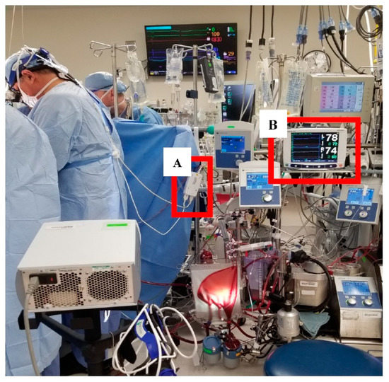 NIRS acquisition device placement in relation to the attending surgeon and cardiopulmonary bypass pump. A. highlights the preamplifier and B. highlights the INVOS™ monitor receiving data from the sensors.