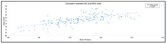 Relationship between mean HR and mean rSO2. A significant positive correlation was found between HR and rSO2 data. Each data point represents the same 60-second interval of HR data and of rSO2 data. The 177 datapoints shown in this figure encompass all phases included in Table 1.