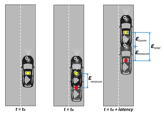 Left to right in the figure: (1) Actual position of the vehicle when the message is sent (). (2) Position estimated by the onboard positioning system. This is the position communicated. Note that there is a longitudinal error. (3) Actual position of the vehicle at . This is the instant in time that the message is received by another vehicle. There is a error caused by the network latency. The receiver needs to deal with a offset.