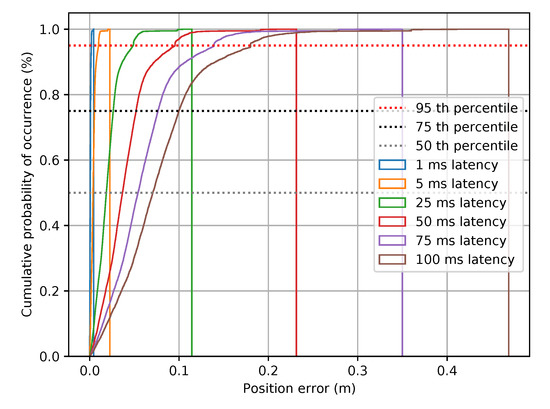 As specified by the European Committee for Standardization (CEN) and European Committee for Electrotechnical Standardization (CENELEC) [38], positioning accuracy is represented with a set of three statistical values given by the 50th, 75th and 95th percentiles of the cumulative distribution function (CDF) of the position error. The empirical CDF obtained in our study with the datasets of Table 2 is depicted in Figure 2 for latencies in the range of 1 to 100 ms. A latency higher than 100 ms would make impossible the real-time processing of the received data, this being the maximum tolerable latency for vehicle-to-vehicle (V2V) communication [39]. For a latency of 25 ms or below, the error’s 95th percentile is below 5 cm, which is negligible for a localisation problem. With 50 ms latency, the 95th percentile is almost 10 cm, and reaches 18 cm with 100 ms latency. Depending on how close the transmitter vehicle’s positioning measurement errors are to the error bounds, these decimetre level errors added by the network latency can definitely affect to the localisation of the transmitter vehicle in the receiver vehicle’s frame. It is also important to consider that even if the network latency does not increase the localisation error outside of the error bounds, the positioning message needs to be received with enough time in advance to trigger a timely reaction.