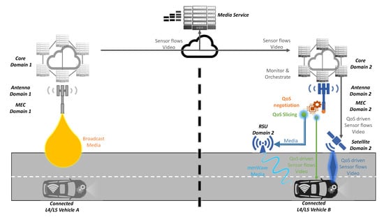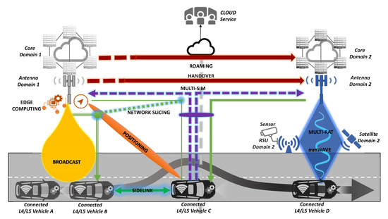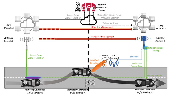In this use case the volume of information sent to the operator is big; the latency of remote actions must be low; the accuracy of positioning is helpful, especially for high speeds; and the reliability and stability of communications are essential to ensure continuous control. To this end, the multi-modal/multi-radio communications [14] are key to operate through an appropriate radio access when the coverage of some of them falls, as presented in Figure 7. Furthermore, the QoS slicing mechanisms [29] can ensure a minimal QoS to allow a coarse-grained environmental view yet a practical one. This use case brings main aspects from mission-critical communications, where the availability of a network slice isolates traffic avoiding bottlenecks or transitory outages potentially introduced by other services or applications. In any case, quick and seamless network handover and roaming are mandatory.
