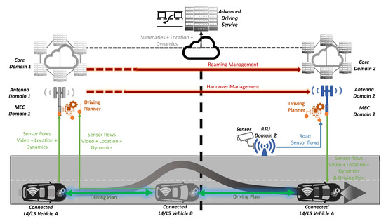 The advanced driving use case involves the participation of different vehicles and infrastructures in order to cooperate and provide information for planning and operating a complex manoeuvre, as depicted in Figure 4. Here, each participant may use a different communication technology. Thus, the interoperability provided by multi-modal/multi-radio technologies of 5G [14] is critical to allow the information exchange from all the surrounding actors. Moreover, sidelink communications such as PC5 C-V2X and 5G NR sidelink [22] add flexibility and versatility enabling data flows between peers once the parties are connected and roles are accepted. As the manoeuvre requires a synchronised response and coordination from vehicles, the network needs to deal with the timely delivery of messages to foster a solid and consistent knowledge at once. Here, the generalied Precision Time Protocol (gPTP) provides reliable time synchronisation as declared in 3GPP TS 23.501 [28]. Furthermore, as the scenario timeframe for such advanced driving use cases is usually small, it is important to minimise communications interruptions and outages while some participants are migrating towards other cells (handover) or other networks (roaming) with low-latency migrations between the network infrastructures.