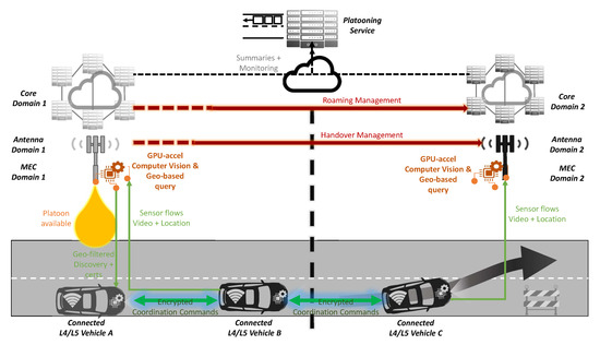 This use case embraces RSUs, V2V and broadcast/multi-cast communications as proposed in [40]. Furthermore, part of the processing load and the clustering of information to the platoon’s region of interest can be managed by the edge computing infrastructures to gain scalability.