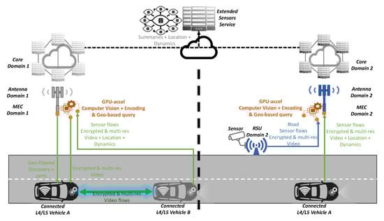 From the latency perspective, sidelink communications [22] make participant communications more direct and quicker. Furthermore, zero latency of edge computing enabled services [11] will bring environmental understanding closer to the users empowering systems shipped at the vehicles with more additional sensor sources. Specifically, edge services linked to discovery and security can boost quality negotiation, selection of region of interest and credentials exchange with an edge entity with a higher standing point to manage configurations according to coordination policies and local performance context, including radio link congestion or vehicles’ computation capacity. In a cross-border context, the utilisation of different edge providers would need common and standard protocol stacks and formats to ensure that common APIs and seamless service provisioning could be done, decoupling services from sensors and infrastructure vendors.