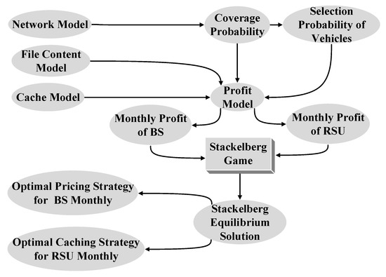 We consider a heterogeneous network consisting of BSs and RSUs. Since the assumptions that the distributions of RSUs (e.g., uniform distribution [17], grid distribution [20]) in some existing models make the analysis not accurate enough, we assume that BSs and RSUs are arranged according to two-dimensional (2D) homogeneous Poisson point process (PPP) and one-dimensional (1D) homogeneous PPP, respectively, based on stochastic geometry theory [28] and point process theory [29]. Then, the coverage probability of effective service of the heterogeneous network is derived. Subsequently, we design a caching incentive scheme based on the Stackelberg game for RSUs. In order to obtain the Stackelberg equilibrium solution, we first establish the profit functions of BS and RSU, respectively. Second, we analyze the concavity and convexity of the profit functions of BSs and RSUs and solve the extreme values to obtain the optimal pricing strategy for the BS and the optimal caching scheme for the RSU. Finally, the Stackelberg equilibrium solution of the game model can be obtained. The structure diagram of the proposed caching incentive scheme is as shown in Figure 1.
