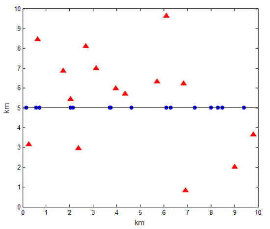 In the Euclidean plane, there is a heterogeneous network with BSs submitting to 2D homogeneous PPP of intensity . Moreover, in the plane, there is one straight way, where RSUs obey 1D homogeneous PPP of intensity . It is assumed that the location distributions of BSs and RSUs are independent of each other, and the communication channels used by the BS and the RSU are different. Therefore, the BS and the RSU will not interfere with each other, and thus the cellular network and the VANET constitute a heterogeneous vehicular network. Here, a simple diagram is drawn as shown in Figure 2, where the red triangle and blue circle represent BS and RSU, respectively, and the line connecting the blue circles represents a straight road.