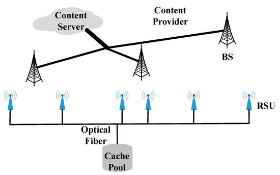 The schematic diagram of caching systems for BSs and RSUs is shown in Figure 3. The operator of cellular network has all files and BSs are connected via a backhaul network, and each BS is connected to the content server. Besides, moving vehicles within the coverage of the cellular network can communicate with the nearest BS to download any files of interest. In a region, the operator of RSUs has a cache pool with sufficient cache space, and the RSUs are connected with each other and all RSUs can link to the cache pool by fiber optic. Since all RSUs are connected to the same pool by optical fiber, they are all able to access the content purchased by any RSU. That is, the RSU can access the content from the cache pool or purchase the content needed from the BS if necessary and capable. Assume that the transmission delay between the cache pool and the RSU is small enough, the moving vehicle with download requests can communicate with the nearest RSU to obtain the files of interest from the cache pool. Besides, the operator of RSUs buys the files from the operator of cellular network as required.