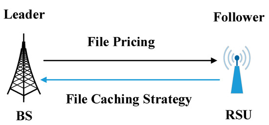 For simplicity, assume that the BSs have all the content files. In order to reduce the network load, improve quality of service, and attract more vehicles to download files, a scheme is designed to encourage the RSUs to cache files. The proposed scheme can effectively motivate the RSU operator to buy and cache files from the BS. In the scheme, the BS prices individual file and charges the RSU operator by the amount of files, and the RSU operator needs to decide how many files to buy and to be stored in the cache pool. Then, the RSU offers download service to the vehicles and charges the vehicles for benefit. As a result, thanks to the reduced network load, BSs can lower the costs of power and bandwidth. As the designer of the caching incentive scheme, the BS has the right to take priority action to design a file pricing strategy. Then, the RSU develops a file caching strategy by the price to decide the number of files to buy. Based on the heterogeneous relationship between BS and RSU, the Stackelberg game is adopted to describe the interaction between these two parties. The Stackelberg game is a commonly used strategic game that consists of leaders and followers competing with each other for certain resources [22]. In this game model, the BS is the leader and the RSU is the follower, and the former moves first and the latter moves subsequently. In order to maximize its own profit, the BS first determines the price of single file. According to the above price, the RSU evaluates whether caching the file can bring profit, and then develops the optimal content caching scheme for maximizing the profit. The game model is shown in Figure 4.