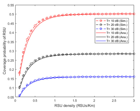 The relationships between the coverage probability of RSU and its density are shown in Figure 5, where the theoretical values are calculated by Equation (13). From the figure, the simulation results are very close to the theoretical ones, especially when the RSU density is larger than 1 RSUs/km. Besides, when the RSU density is small, the coverage probability increases with the increase of the RSU density. When the RSU density is large enough, the sum of the interference RSUs is so large that the noise can be ignored. In addition, the coverage probability hardly increases after reaching a certain value. In particular, when the SINR thresholds are 10dB, 20dB, and 30 dB, the upper limits of the curves of coverage probability are 0.501, 0.284, and 0.160, respectively, which are consistent with the calculation results of Equation (14).