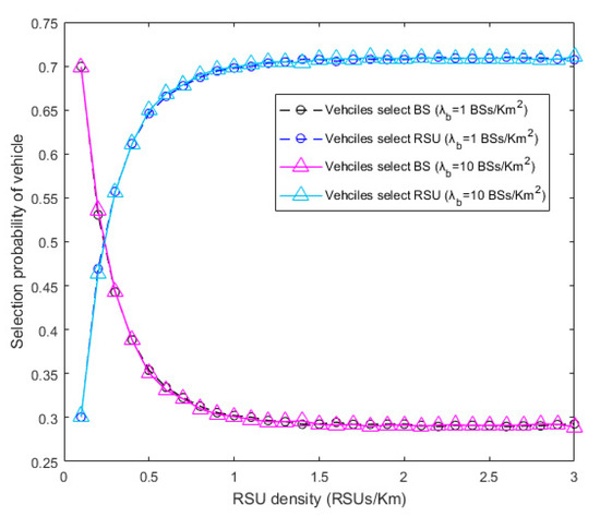 Note that when calculating the operator selection probability of the vehicle based on the coverage probability, the densities of BSs and RSUs are supposed to be large enough. As a result, the selection probability of the vehicle is a specific value independent of the noise and the densities of BSs or RSUs.