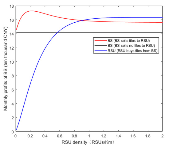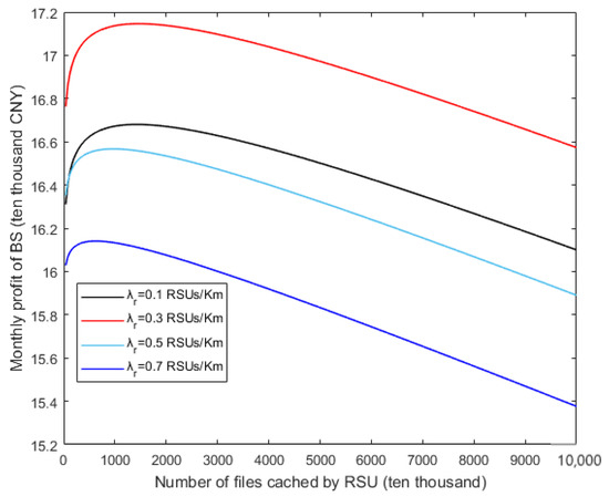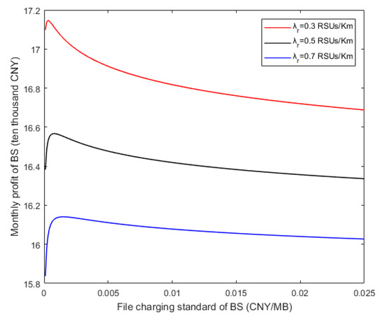 In Figure 9, the relationships between the monthly profit of BS and file charging standard of BS under different RSU densities are given. In fact, the relationship between the file charging standard of BS () and the number of cache files () satisfies Equation (30). That is, similar to the growth trend of the curve in Figure 8, with the increase of the file charging standard of the BS, the monthly profit of the BS first increases and then gradually decreases. In consequence, there exists the optimal file pricing maximizing the monthly profit of the BS. As a matter of fact, when the file charging standard is too low, the profit of files is very low. Then, the RSU will buy a large number of files, but it cannot bring enough profit to the BS. Inversely, when the file charging standard is too high, the RSU will be less willing to buy files from the BS, and then the BS will lose the profit from the RSU. According to the downward trends of different curves in the figure, the more the RSU density increases, the less the monthly profit of the BS decreases.