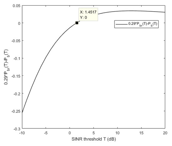 From Equation (36), the concavity and convexity of the profit function of the BS () depend on being positive or negative. Since the expression w.r.t. is complicated, the curve is just plotted for the convenience of showing the relations of them in Figure 10. As seen from the figure, when , ; when , . As a result, only when the vehicle’s demand for the SINR threshold is greater than 1.452 dB, the proposed caching incentive scheme of RSU is valid. Otherwise, no matter how high the RSU density is, the proposed scheme will lower the profit of BS and the BS will not allow the RSU to cache any files from itself. In the simulation, assume the requirement of the vehicle is , so that the SINR threshold is about 13dB.
