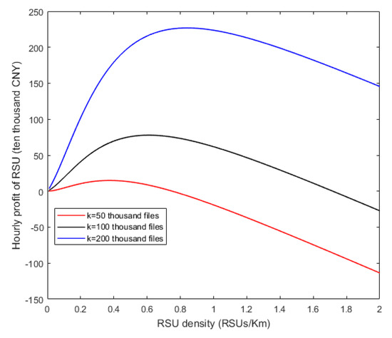 As shown in Figure 11, the different curves represent the relationship between the hourly profit of RSU and the RSU density with different number of downloading requests of files per hour (). If the optimal number of caching files per month of the RSU () has been determined, some RSUs need to be turned on or off during the day to adjust the active RSU density depending on the hourly traffic density for maximizing the hourly profit with considering the hourly running cost of RSUs. From the figure, the hourly profit function for the RSU is a concave function of the RSU density and the maximum is in existence. Consistent with that discussed in Section 4, different curves have different abscissa values when they reach their highest points, i.e., the density of running RSUs should be adjusted by different values of at different hours of a day for maximizing the profit. When the profit function obtains the maximum, the profit of the RSU will decrease with the increase of the RSU density. The reason is that when the RSU density is large enough, the coverage probability of the heterogeneous network and the probability that the vehicle chooses the RSU almost cease to increase, while the running cost of RSUs increases linearly with the RSU density. As the curve at the bottom shown, when is small, the profit from the vehicles at the RSUs is less than the running cost of RSUs. In this situation, all the RSUs should be turned off (the RSU density is 0) and no longer serve the vehicles to avoid deficit.