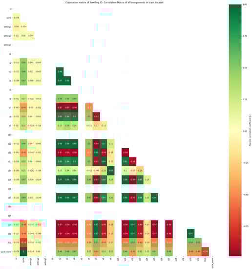 The Pearson correlation coefficient r represents the correlation between two variables X and Y as a value between +1 and −1, and 0 indicates that there is no relationship. n is the number of samples, X i and Y i are the two sample points, and X ¯ and Y ¯ are the averages. Here, as the correlation coefficient between X and Y approaches 1, it implies that when one increases, the other tends to increase as well. The correlation matrix heat map expresses the correlation coefficient in terms of numbers and colors [32]. Figure 2 shows the correlation matrix heat map of the C-MAPSS dataset. Among the many input variables, one should focus on the correlation between sensor data from s1 to s21. Positive correlations are indicated by green, negative correlations are indicated by red, and no correlation is indicated by white. When the row and column numbers are the same, the correlation coefficient is always one because it is the correlation coefficient for itself; thus, the diagonal line’s upper right portion is omitted for convenience. In the correlation analysis, the high correlation between X and Y indicates their tendency to increase or decrease together. However, Y does not necessarily increase as X increases.
