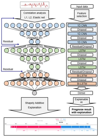 The proposed deep-stacked convolutional Bi-LSTM model with dimensionality reduction and explainable artificial intelligence is shown in Figure 3. In this study, a DNN was constructed using the CNN, LSTM, and Bi-LSTM algorithms. The three CNN layers extract spatial characteristics, the three LSTM layers extract temporal characteristics, and the two Bi-LSTM layers extract spatial and temporal characteristics through a bidirectional pass. In addition, the residual network and dropout technique were adapted to achieve accuracy and optimization. Moreover, to solve the practical problem regarding the prognosis of a turbofan engine’s RUL, correlation analysis, and regularization among dimensionality reduction techniques, and SHAP among explainable artificial intelligence techniques, were applied.