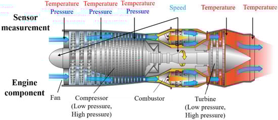 In this study, a turbofan engine’s RUL is given a prognosis using the C-MAPSS dataset FD001 of NASA. The turbofan engine consists of various components (fan, low pressure compressor, high pressure compressor, low pressure turbine, high pressure turbine, combustor, and nozzle), and the structure is shown in Figure 4. The information of each component, such as the temperature, pressure, speed, and air ratio, is acquired through sensors. The C-MAPSS dataset consists of four subsets, as shown in Table 1. Each subset is configured differently in terms of the number of engines, operating conditions, and failure types. The dataset also provides training data, test data, and RUL data, which are appropriate. The C-MAPSS dataset consists of 21 sensors that measure engine status and information from three operating settings; the list and corresponding physical meanings are presented in Table 2. The 24 multivariate time-series signals contain noise when depicting real data and illustrate the degradation until the engine fails as a time-series trajectory. Some engine sensor information indicates a direct deterioration trend for the engine, but some contain little or no information regarding performance degradation. In practical scenarios, domain experts and decision-makers can use information from sensors to monitor the turbofan engine’s condition and detect or rectify malfunctions. Furthermore, it is possible to predict performance degradation and RUL.