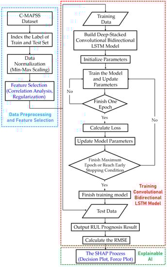 The remainder of this paper is organized as follows. Section 2 describes the 1D CNN, LSTM, and Bi-LSTM algorithms and network architecture techniques for improving accuracy by constructing a DNN. In addition, correlation analysis and regularization among the dimensionality reduction techniques, considering the turbofan engine’s characteristics, and the SHAP algorithm among explainable AI techniques for analyzing the prognosis results are described. Section 3 describes the experimental study and results, and the paper is concluded in Section 4.