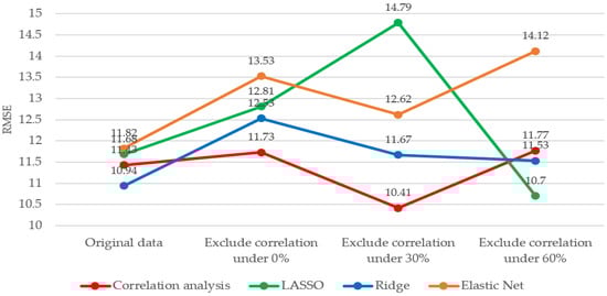 The results of applying regularization were analyzed while changing the number of sensors according to the correlation analysis. A comparison of each regularization result is shown in Figure 6. When regularization was used on the original dataset, the accuracies of LASSO and Elastic Net were low; however, Ridge exhibited high accuracy. In excluding sensor data with a correlation of 0% and sensor data with less than 30%, LASSO, Ridge, and Elastic Net exhibited low accuracy. This result indicates that, although complexity can be reduced through regularization, the information necessary for learning is also removed. On excluding sensor data with a correlation of less than 60%, the accuracy was high when LASSO and Ridge were used. This shows that regularization played a role in mitigating the dataset’s multicollinearity problem. If the number of sensors is reduced through correlation analysis, the model’s complexity can be reduced, and the prediction accuracy can be improved. However, if excessive sensors are excluded, the features required for the prediction cannot be learned. This shows that the feature selection technique considering the number of features and missing values in the dataset could be optimized to obtain the best prediction result.