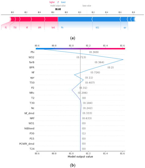 Figure 7. (a) SHAP force plot for engine No. 41 and (b) SHAP decision plot for engine No. 41.