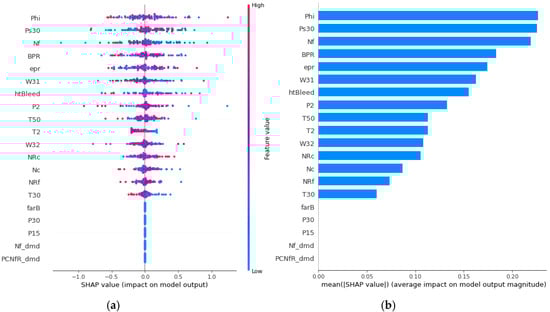 As a result of studying the influence of the turbofan engine dataset using the regression tree, the influence of sensor 7 (P30), sensor 12 (Phi), and sensor 21 (W32) was found to be high [20]. The SHAP analysis conducted in this study showed that sensor 12 (phi) has the most significant effect on RUL prediction, and sensor 21 (W32) has the 11th largest effect. However, it is necessary to consider that the RMSE is not as high as 36.08, obtained for the study using the regression tree. For appropriate analyses, it is necessary to use an accurate model with small errors before applying SHAP. It is also worth noting that the description of the SHAP is not absolute in actual engine management because the description of SHAP is based on prediction, even if it is analyzed using an accurate model. However, assuming that the description results have been analyzed by decision-makers or domain experts, they can be reflected in maintenance or equipment replacement plans, contributing to the longevity of turbofan engines.