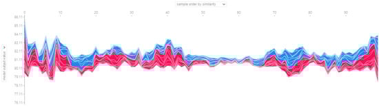 The force plot in Figure 9 vertically accumulates and aligns each sensor’s Shapley values for 100 engines of FD001. Although listed according to similarity, it can be seen that the characteristics of the sensors for RUL prediction are different.