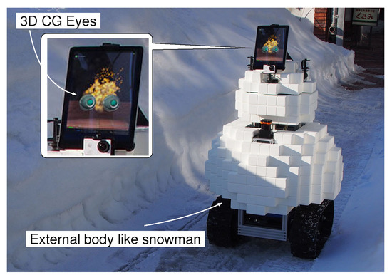 In recent years, social robots used in public spaces have been studied and developed actively. We are studying an information service robot with a face in a snowy cold region, as shown in Figure 1. When the robot wandered among pedestrians on a sidewalk, many children were glad to meet it. However, although the robot has a face with eyes and an exterior body made with soft material like a snowman, some adults obviously avoided the robot, and it seemed that the robot made them feel uncomfortable.