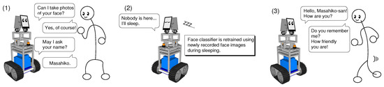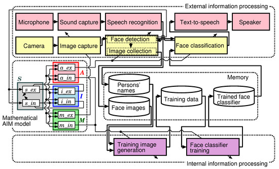 Figure 7 shows relations between the mathematical AIM model and processes for the face memorization function. A microphone is used for collecting persons’ names by voice recognition. A camera is used to detect people’s faces, and collect images of strangers’ faces. When a stranger’s face is detected, the robot asks for her/his name using text-to-speech function and collects her/his face images and name with her/his permission.