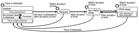This system described above is controlled by a finite state machine shown in Figure 3. The system has four states: awaken, relaxed, non-REM sleep and REM sleep. The state transitions are described in detail in the next sub-section. While the robot detects a person, the system is in the waking state. The robot calls the name of her/him it remembers, or collects her/his facial images when she/he is a stranger. After the robot detects no person, the system shifts to the sleep state through the relaxed state. In the REM sleep state, the face classifier is (re-)trained.