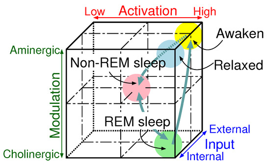 The AIM state-space model proposed by Hobson [21] is shown in Figure 4. Humans’ consciousness states are expressed depending on levels of the following three elements. Activation controls processing power. Input switches information sources. Modulation switches external and internal information processing modes. In an waking state, external information obtained by external sensory organs is processed actively. A human dreams in rapid eye movement (REM) sleep, and it is said that stored internal information is processed actively. In non-REM sleep, input and output gates are closed and the processing power declines totally.