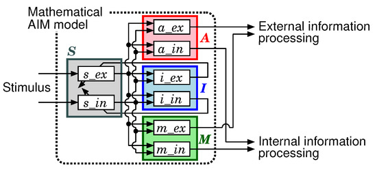 The block diagram of the mathematical AIM model is shown in Figure 5. The mathematical AIM model controls ratios among the external and internal information processors. The element S calculates stimuli, such as changes of perceptual information, extracted from sampled data. The element A decides an execution frequency of each information processor. The element I decides parameters used when stimuli are calculated in S. The element M decides an execution frequency for each sensory data capture. Each element consists of two sub-elements. The subscripts and mean that the sub-elements relate to external and internal respectively.