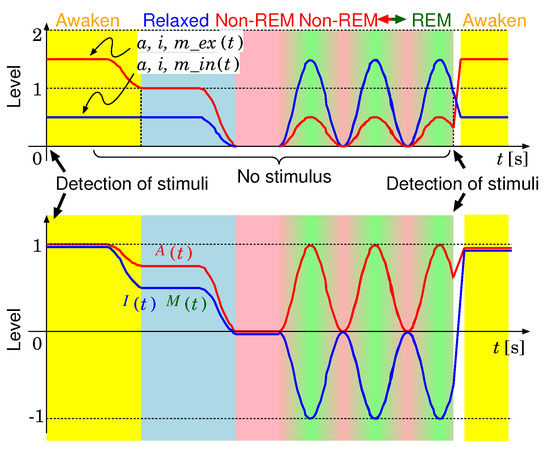 An example of the variations of the sub-elements with time is shown in the upper figure of Figure 6. While an external stimulus is detected, the levels of the elements related to the external are higher than those related to the internal. After the external stimulus becomes lower than a threshold, the state is shifted to relaxing. After a certain time, first, the state is shifted to the non-REM sleep. Then, each level increases and decreases periodically. When again a stimulus is detected, the state shifts to the waking state. The lower figure of Figure 6 shows the variations of A, I and M calculated from their sub-elements with time.
