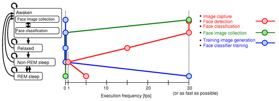 The current state of the robot system is determined depending on the combination of the values of A, I and M as shown in Table 1. Moreover, there are two kinds of modes in the waking state. One is a face image collecting mode, and the other is a face classification mode. The system is normally in the face classification mode. When the face classifier finds a stranger’s face, the mode translates to the face image collecting mode. Figure 8 shows both a state transition diagram and values of execution frequencies related to the image processing. The execution frequency of the face detection does not become less than 1 (fps) even in the REM or non-REM sleep; as a result, the system can wake up from sleep when a human face is detected in a captured image.