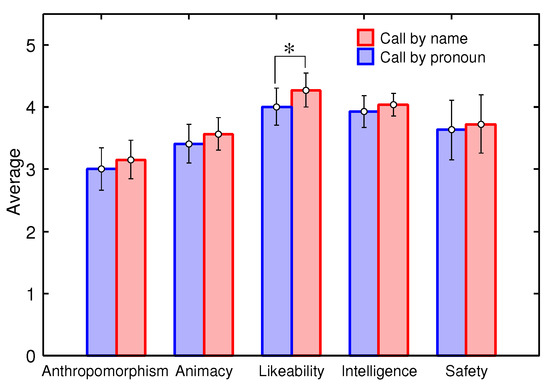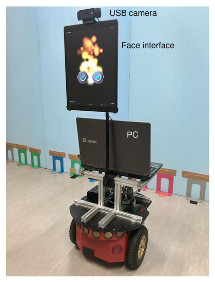 Kanda et al. or Ishiguro et al. conducted human–robot interaction experiments in several environments: an elementary school, an office and a shopping mall [10,11,12,13]. The mobile robots used in these experiments could call a person’s name by using information embedded in the RFID tag, and it was described in [11] that, “Many children were attracted by the robot’s name-calling behavior.” Chen et al. [14] conducted experiments in which a robot called out to a person by name, and investigated the reaction time, and showed that there was a significant difference between calling out a person by name and not calling out a person by name. Like these studies, name calling is one of the important functions for social robots. However, the studies are still not enough, and there is no experiment that quantitatively evaluates the impression the robot gives to a person by name calling.
