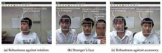 Figure 10a–c shows some face classification results. As shown in Figure 10a, the face classifier works well when a face is rotated obliquely. As shown in Figure 10b,c, there was no influence of the presence or absence of a pair of glasses, and a person who was not included in the trained classifier could be classified as a stranger. Table 3 shows the computational times of the face detection and the classification.