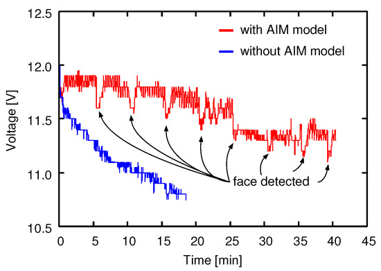 Figure 11 shows the battery voltage variations with time with/without AIM. In the case of without the AIM model, since the face detection and classification processes were executed as fast as possible, the voltage decreased quickly. In the case of with the AIM model, although we woke the system by showing our faces in front of the camera about every five minutes, since the execution frequency of the image processing became lower through the operation of the AIM model in the sleeping mode, the electricity consumption could be cut.