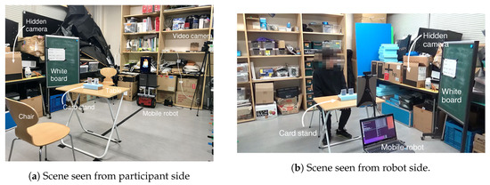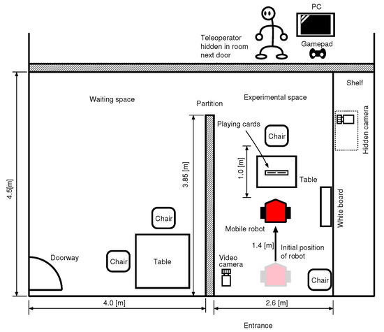 Figure 12 and Figure 13a,b show an experimental environment. The waiting space and the experimental space were divided by a partition. Only one research participant entered this place at once. The experimenter always sat on a chair in the waiting space. An operator for the WOZ was in a room next door, and teleoperated the mobile robot in the experimental space with a gamepad and a monitor. The operator could watch the entire experimental room and the position of the joker set on the card stand through a hidden camera shown in Figure 13a. Figure 13b shows one scene during an experiment.
